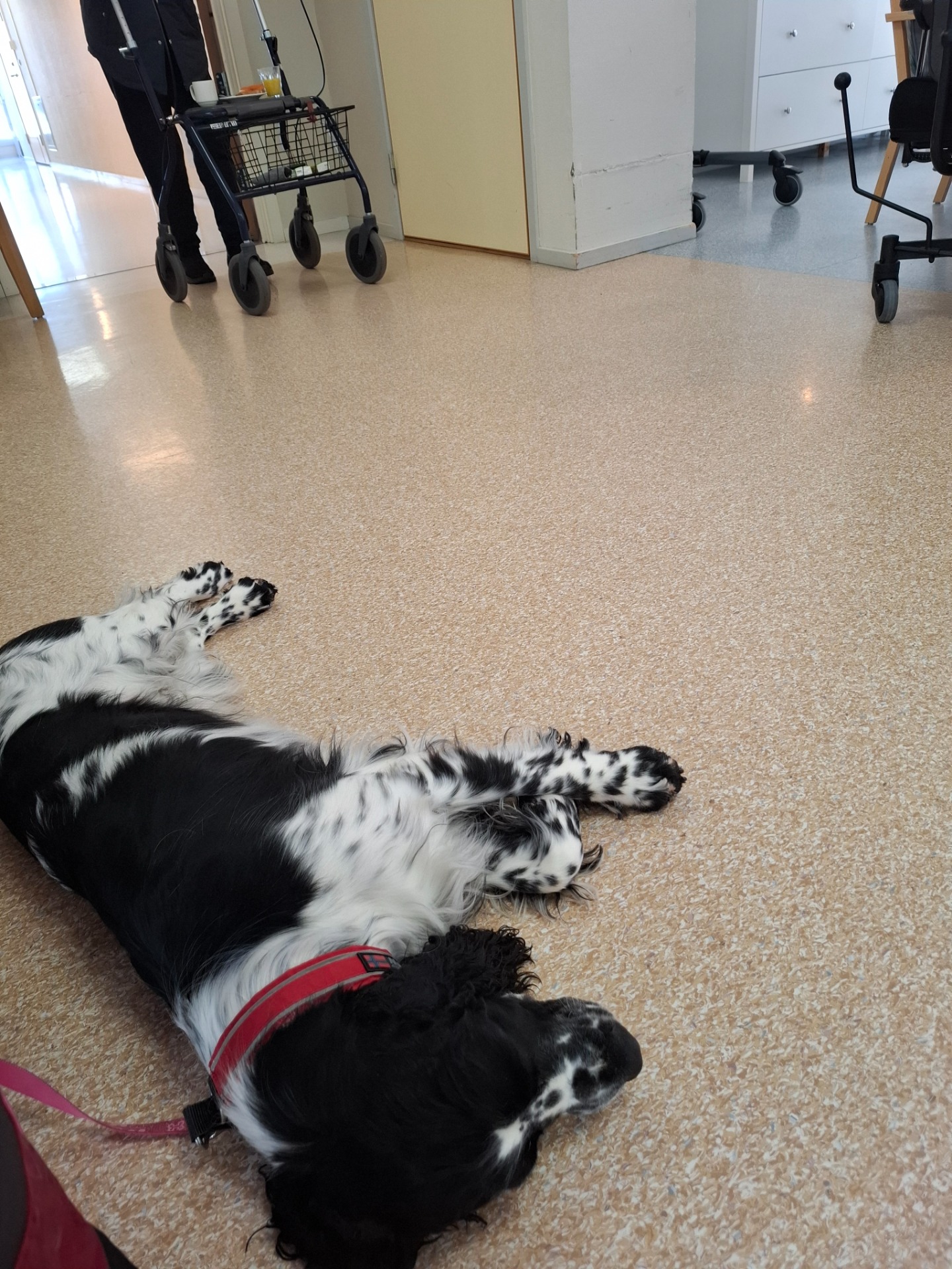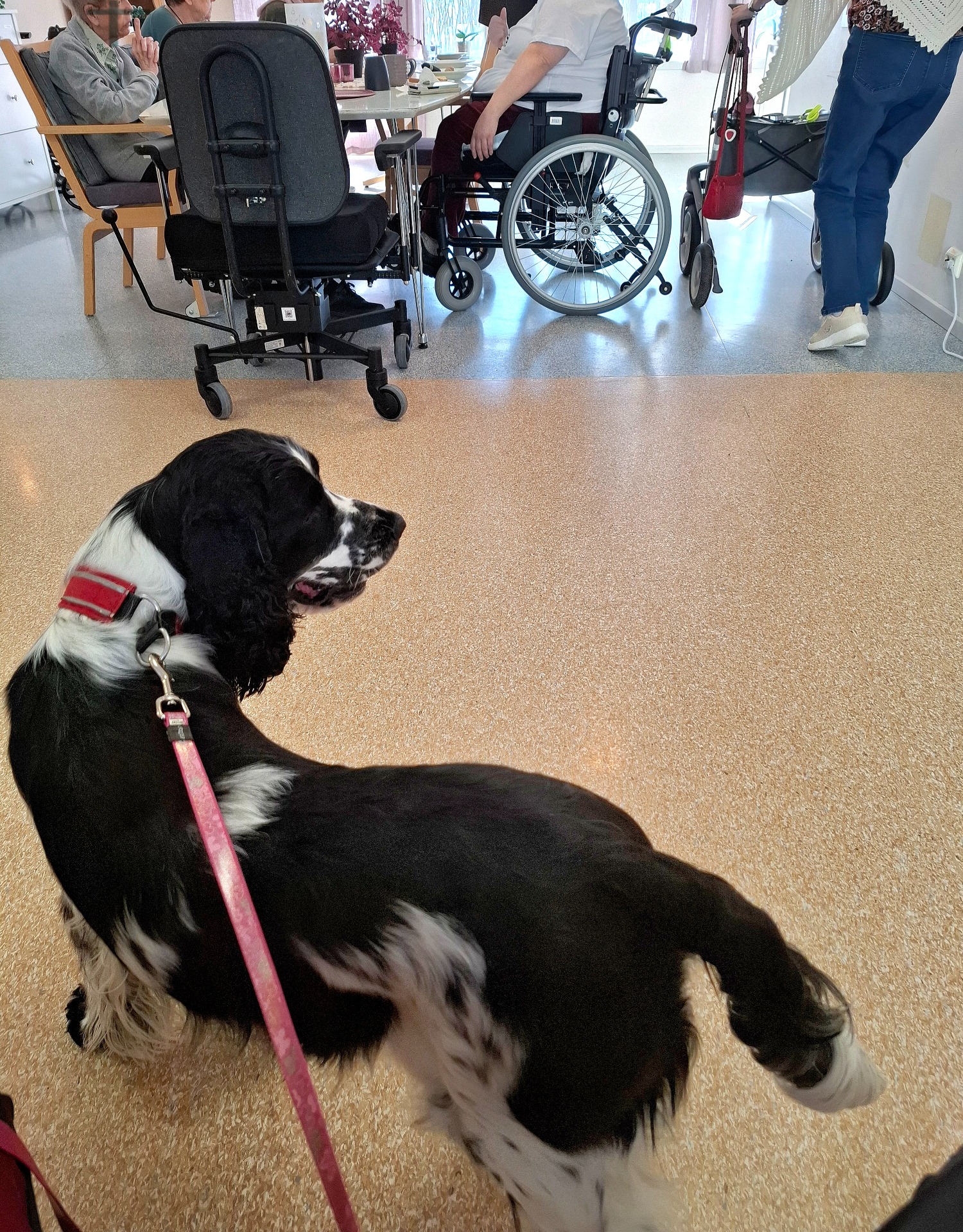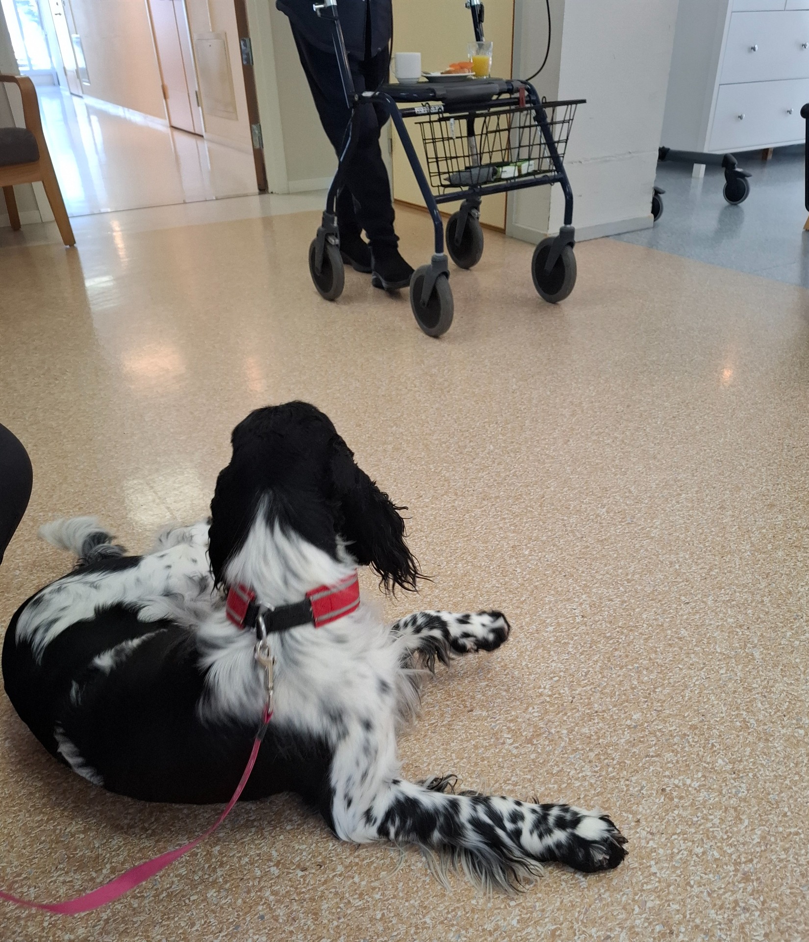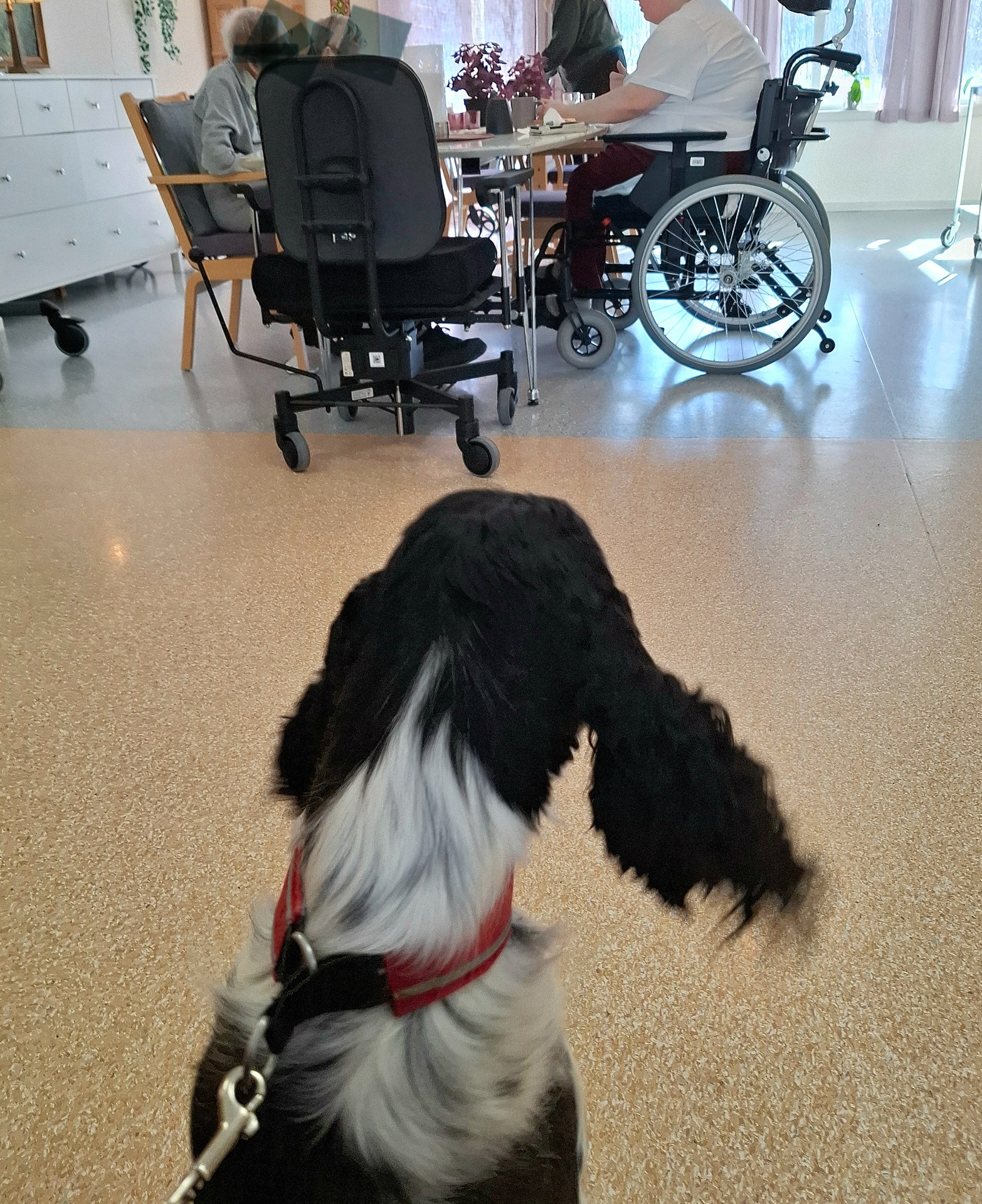 Linka 18 mndr begynner nå å være med meg på besøk og tilvenning i bosenter. Når hun fyller 2 år skal vi prøve å komme med på godkjenningskurs for besøksvenn, fordi jeg trenger flere hunder å bytte på. Dette er bilder fra hennes første besøk på fellesrom. Hun var litt overtent i møte med nye mennesker, men roen kom mer og mer etter at mange flinke og trygge hender hadde klappet henne. Hjelpemidler på hjul var nytt så tett på henne, men når hun oppdaget at det fantes godbiter der, så var all skepsis borte. Til slutt klarte hun faktisk, av seg selv, å bli liggende om hjul og føtter gikk forbi, så avknappen finnes 🤩 På bildene nedenfor sitter vi og bare jobber med tilvenning under en lunsj på avdelingen (veldig fristende med så mye matdufter også).
