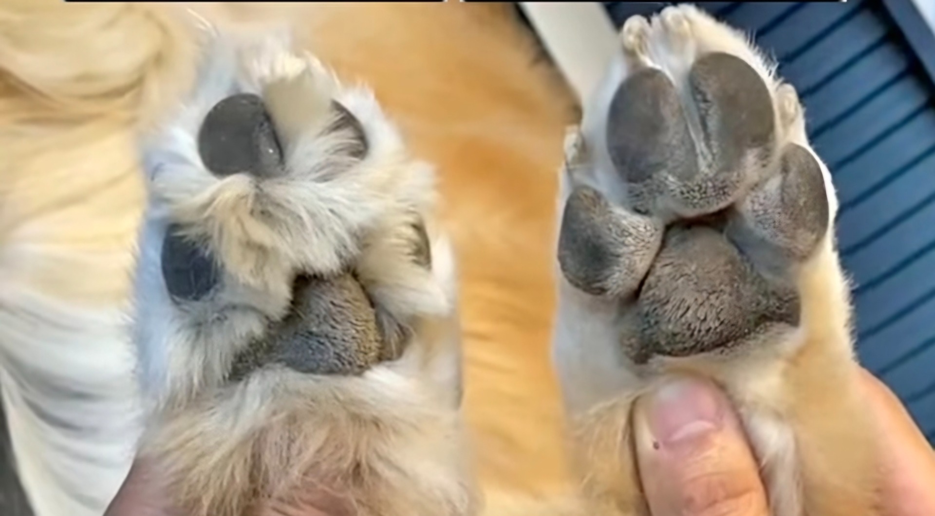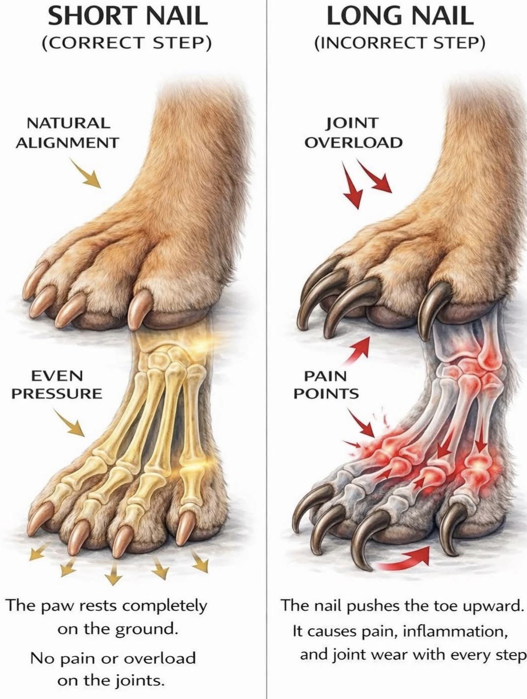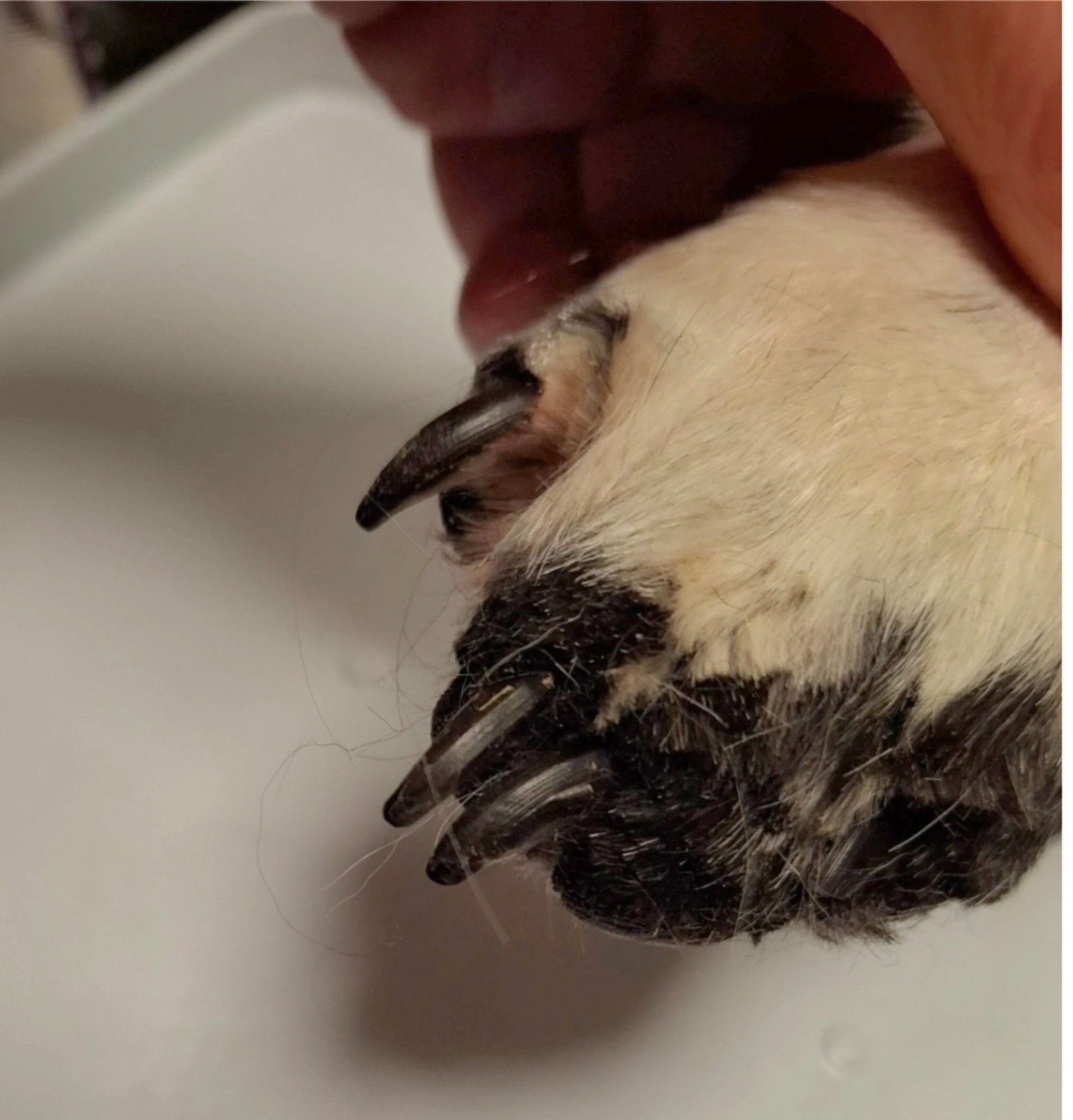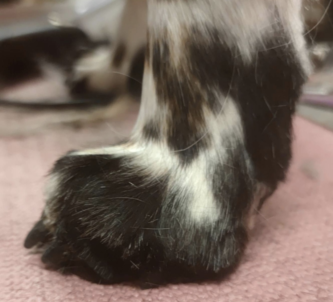 Disse klørne har fått vokse seg altfor lange. De høres godt mot golvet og poten kan forandre form når klørne presser den i en unaturlig stilling.