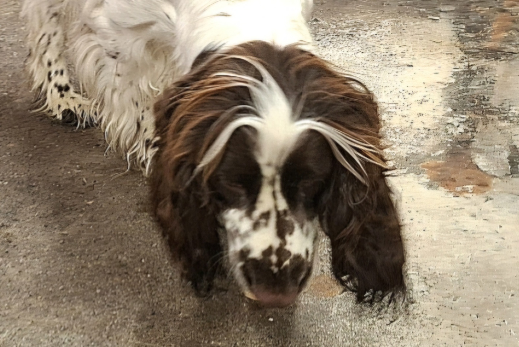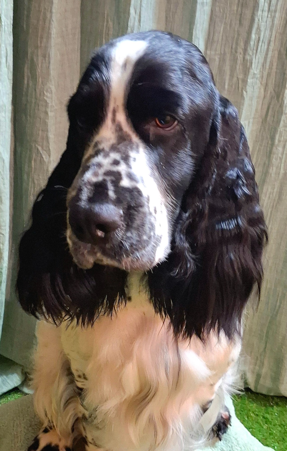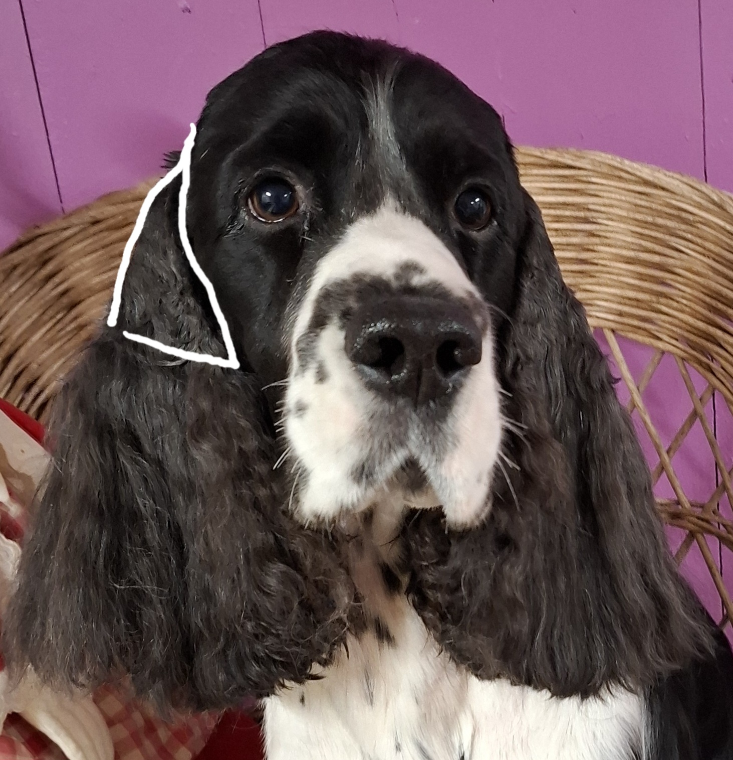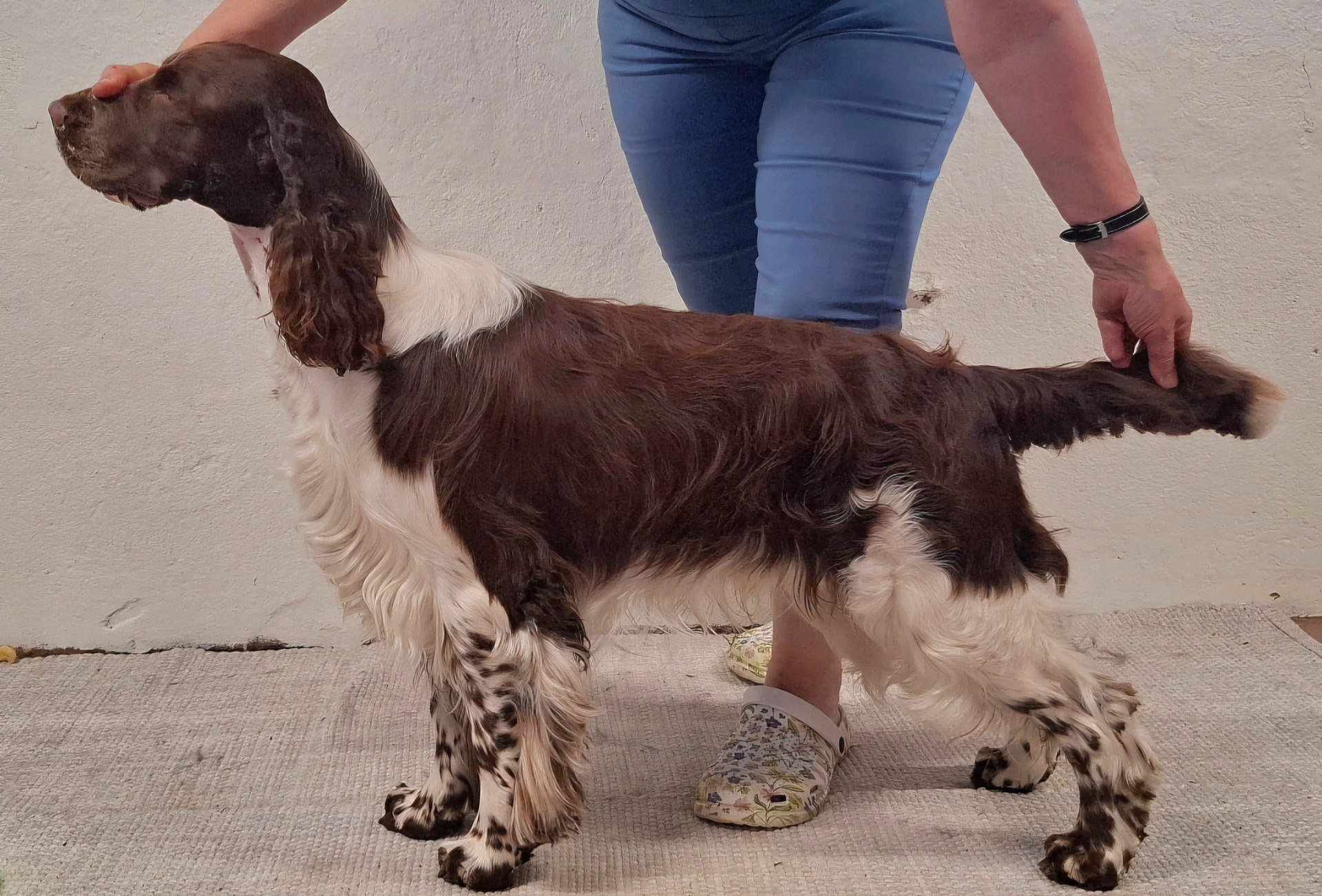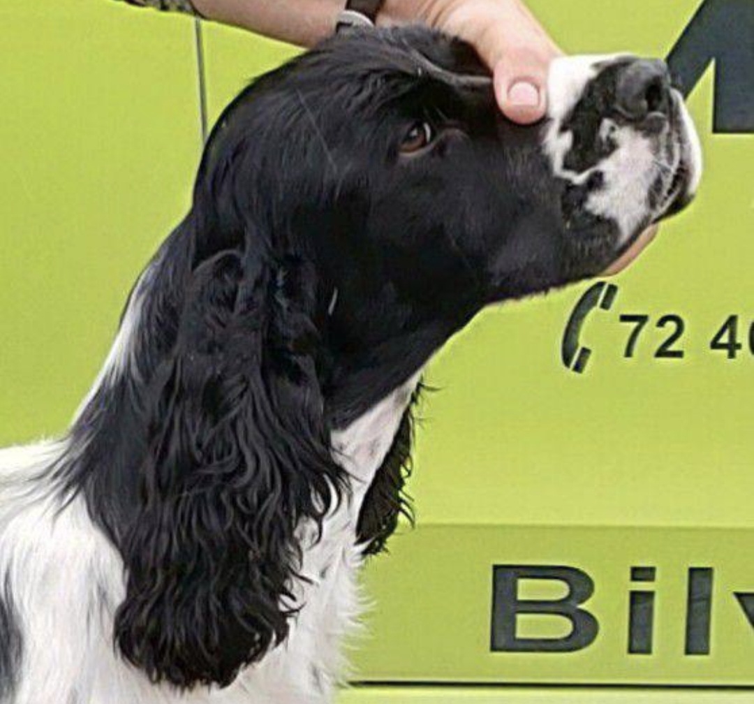 Dette er et nyklippet og velstelt hode med ører som er klippet kort øverst rundt ørefestet, slik at det lave ørefestet kommer frem, den typiske springerhode kommer frem, og det blir luftig rundt øreåpningen og luft kommer bedre til nedover i den lange øregangen. Strekk ut øret med ene hånden slik at øreskinnet blir stramt uten folder og før maskinen ganske tett mot pels/hud, i vekstretningen av pelsen, dvs nedover. Da blir det kort og glatt overflate. Start der øret er festet til hodet og stopp ca 1/3 nede på øret. Du kan bruke maskin eller effileringssaks på kinnet også hvis det er tykk pels der, det gir et smalere inntrykk av hodet. Dvs mellom ørefestet og øyet og litt nedover på kinnet.