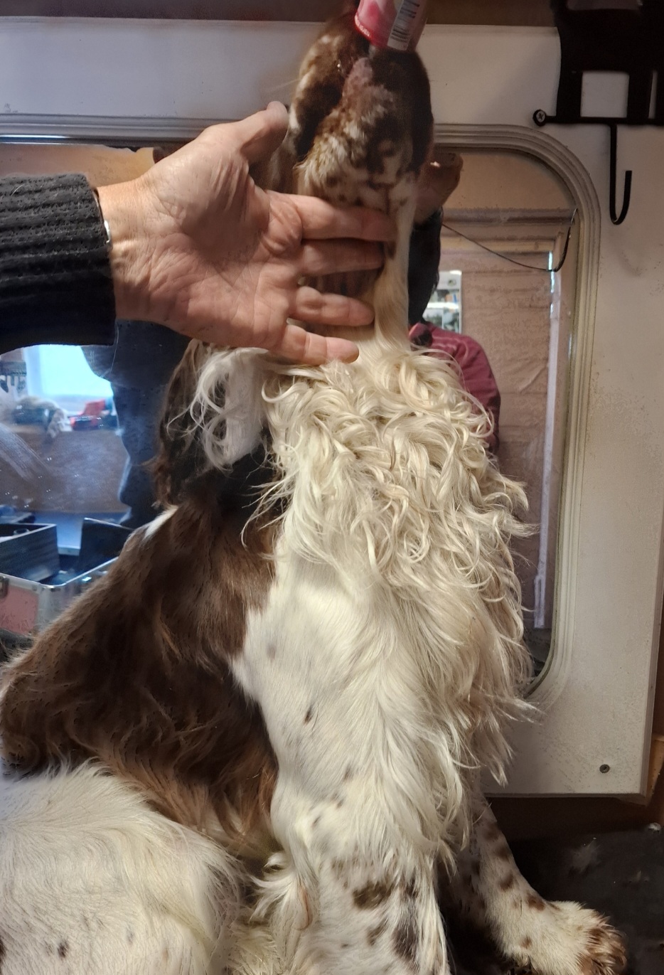 Disse to halene (over og under) er helt forvokste og samler med seg mye skitt, kvist og kvas som de slenger rundt seg når de logrer. Den øverste har normal tykkelse og trenger bare en klipp av underlinjen. Halen på bildet under er tykk og full av ull som skal ut før klipp. Da kan kan bruke en coat king, strikk-kam eller dobbeltannet lusekam etter hvert, om den går gjennom. Coat king finnes i ulike grovheter, en med flere buer, f.eks 19, tar mer pels enn en med færre buer/tagger. Når ullen er ute og halen har blitt smal, kan man klippe undersiden, se gul strek. Lengden mot haletuppen skal rekke til hasen, og pelsen klippes av litt utenfor halebenet. Obs hold figrene i mellom og ikke klipp i bentuppen, det blør veldig !