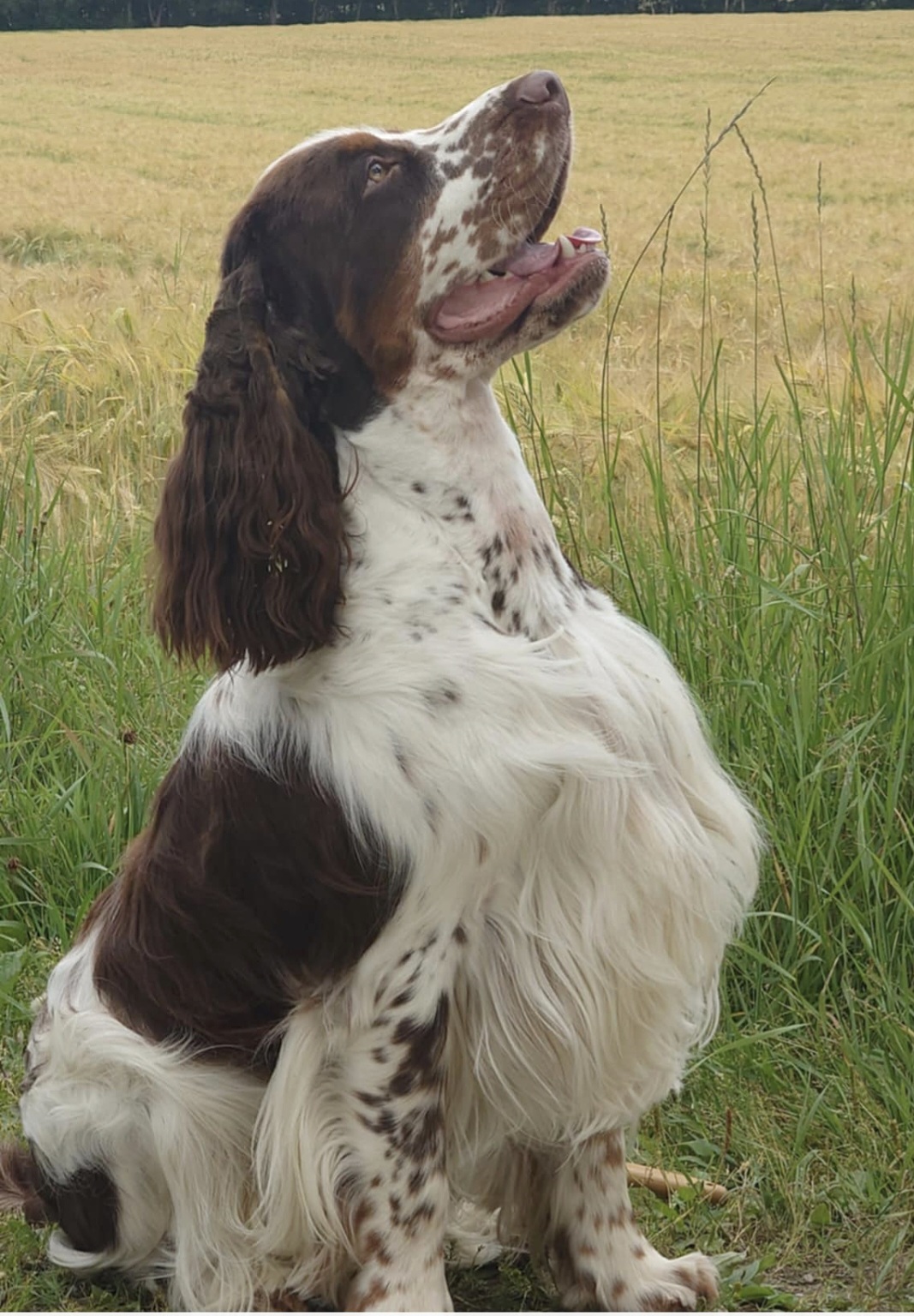 Når en voksen hann er ferdig klippet fram, kan det se slik ut. Halsen er glatt og kort og man har spart brystbehenget. Behenget ivaretas ved å holde det flokefritt og børste det med en myk karde, gjerne med gummiknotter på. Det samme bruker man på ørebehenget når man har fått ut eventuelle floker og klumper. Bruk en spaniel matkopp (smal øverst) slik at ørene ikke havner i maten.