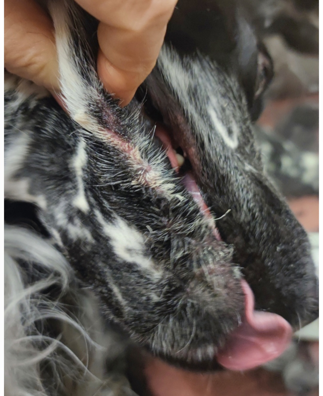 1. hold området kortklippet så det er minst mulig pels her som holder på sikkel og vann. Brett ut huden på utsiden av underkjeven/underleppen, så du ser bunnen av folden. Klipp heylt kort med saks eller maskin. Kjør mothårs da blir det minst pels igjen. Lurt å venne hunden til dette stellet tidlig.