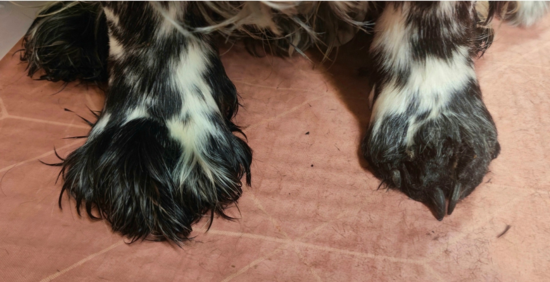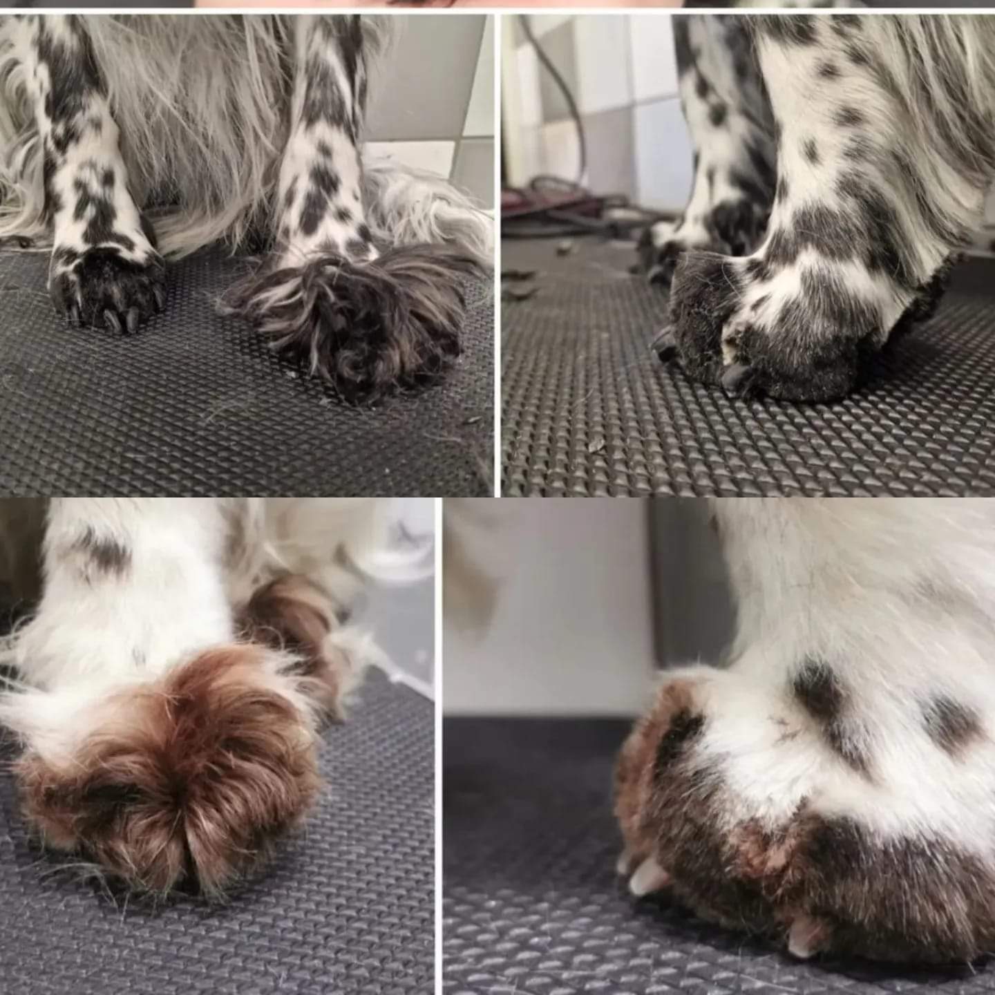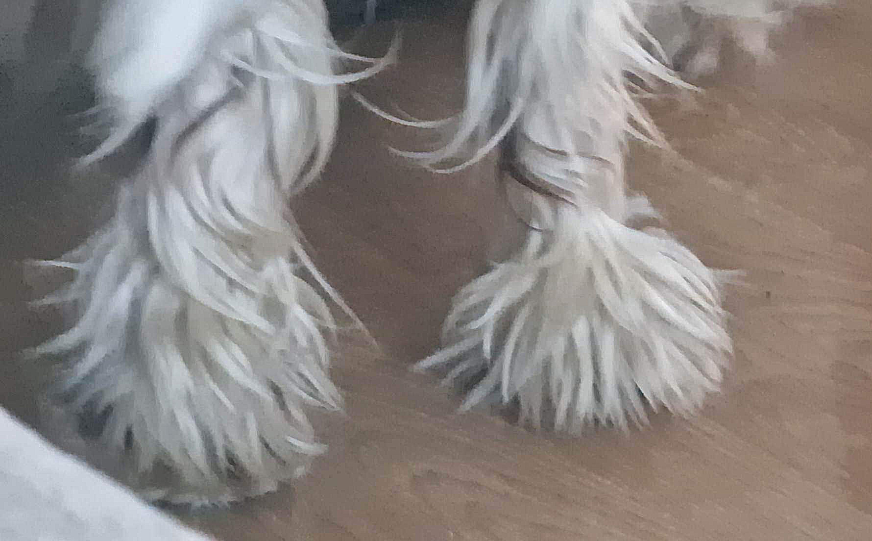 Her er forbena, en uklippet pote og en nyklippet t.h. Pelsen under og inni potene kan ofte misfarget/rødbrun pga ofte våte poter når de er ute, og det er også gjennom potene at hunden regulerer svettingen.