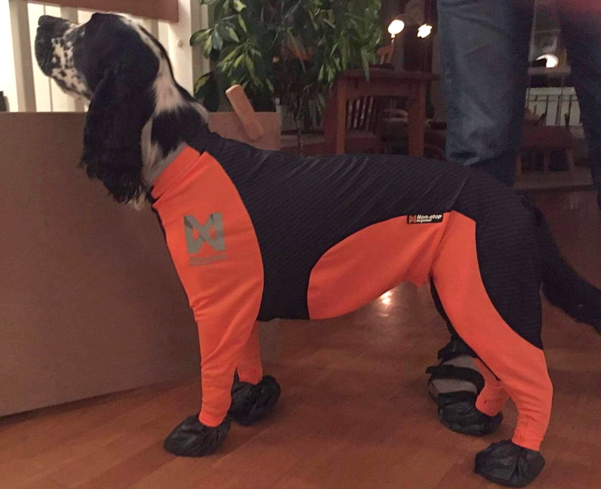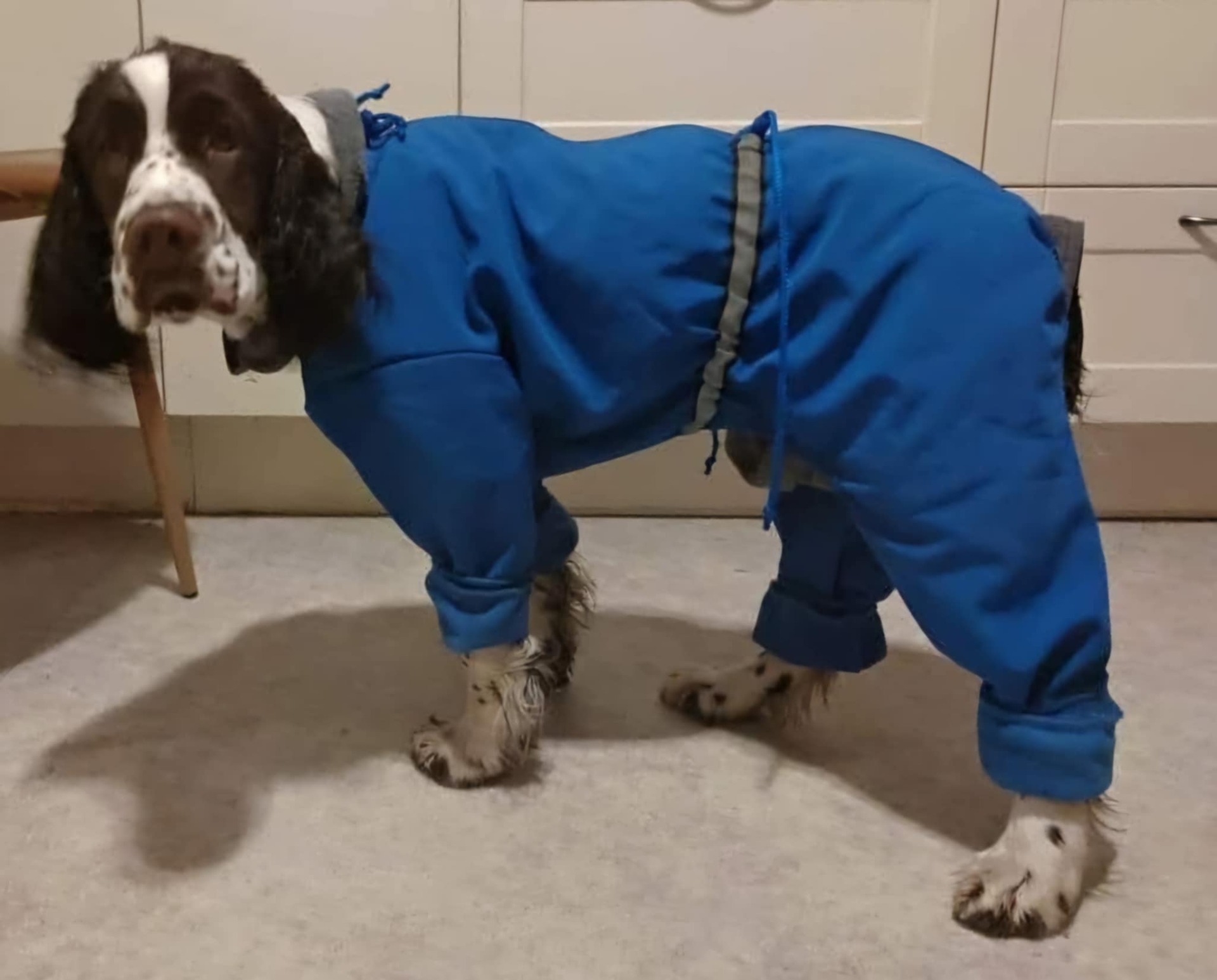 En strechi dress, her NonStop, er nødvendig i kramsnø for unngå tunge snøballer i behenget. Også potesokker kan bære lurt, da hunden ellers ofte legger seg ned for å gnage vekk snøklumper under potene. Denne dressen er ikke så egnet i skog med grener, kvister og kratt, da går det hull i stoffet.