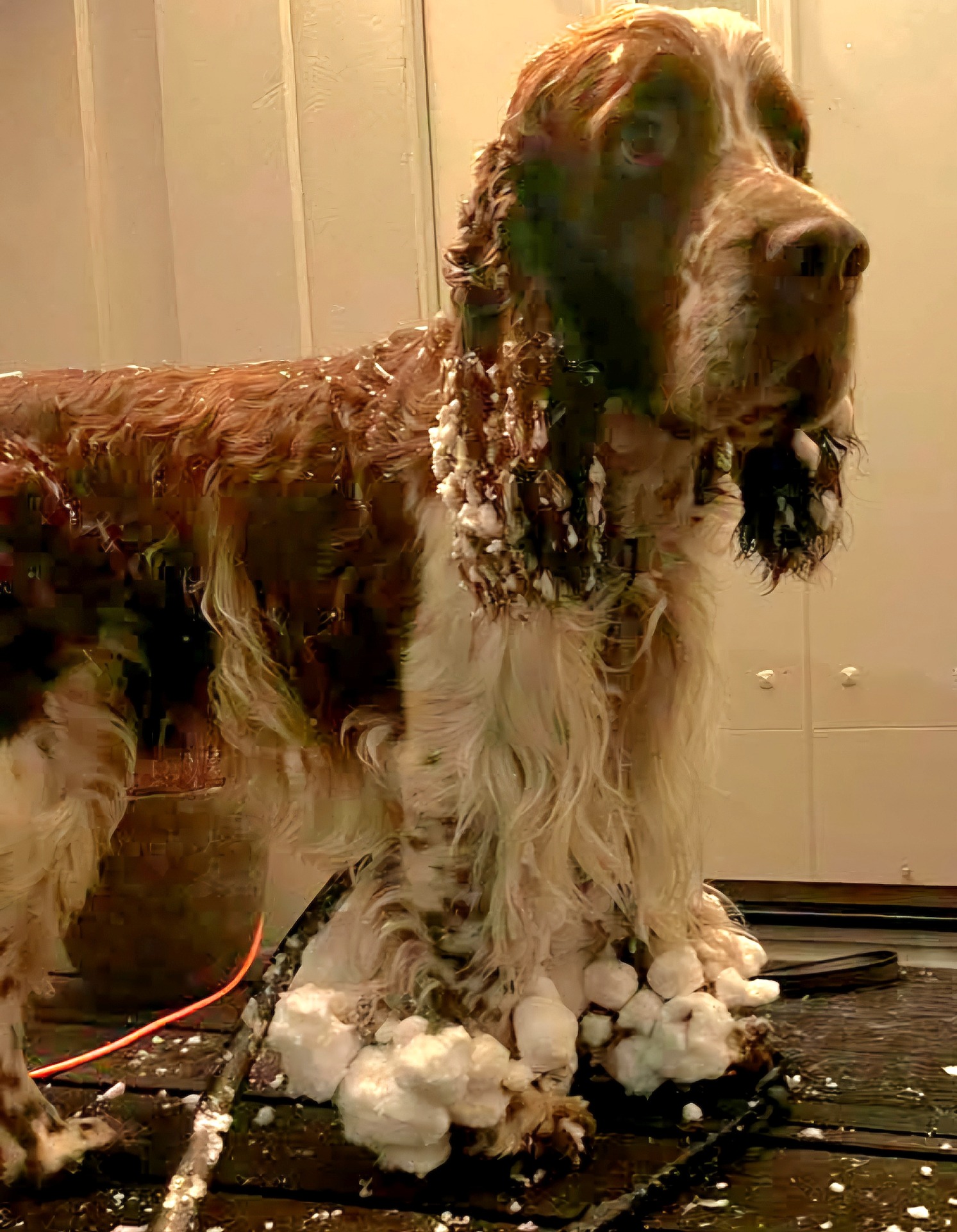 Snøballer fjernes best med en varm dusj. De må ikke klippes av for da forsvinner behenget også.