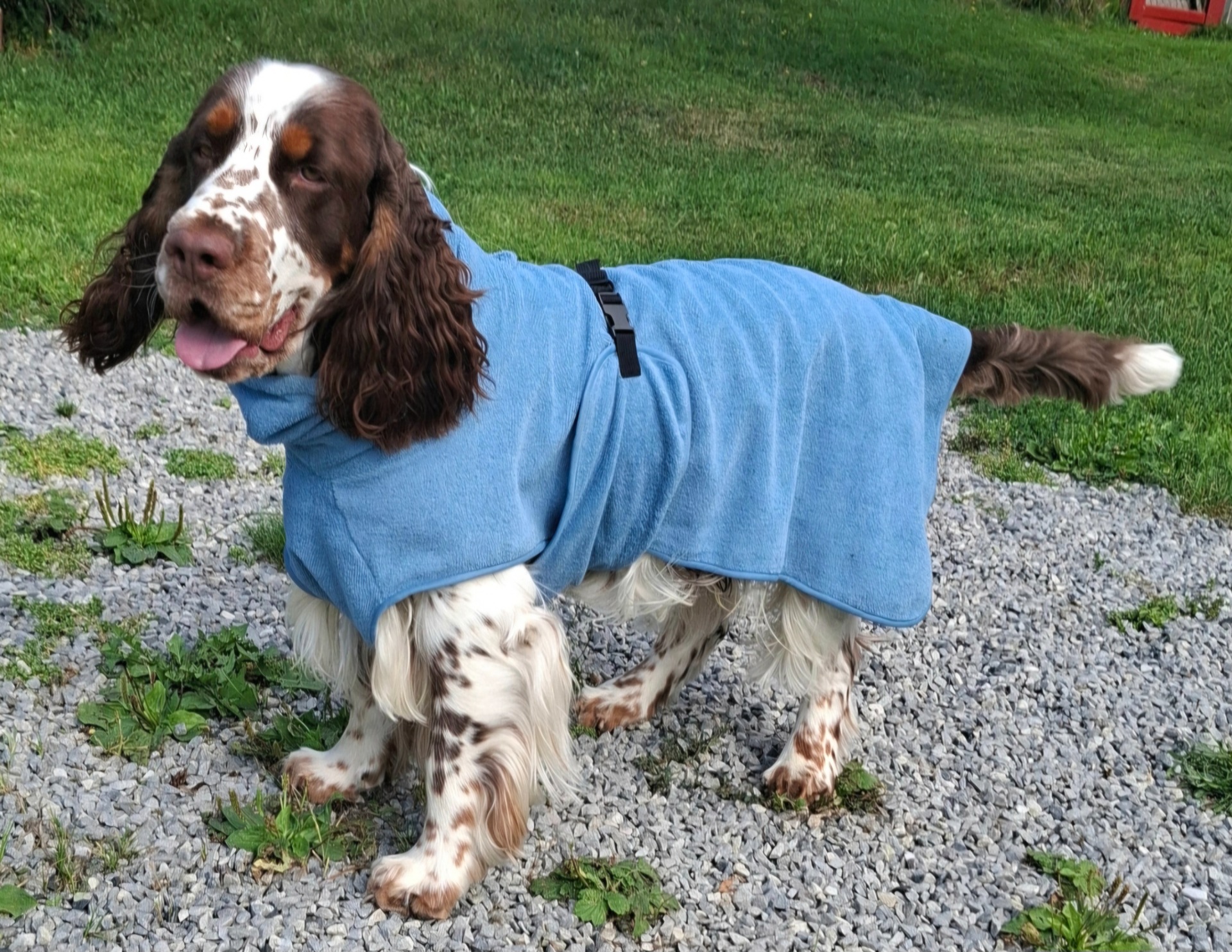 Tørkedekken får du kjøpt i mange butikker, dette er kjøpt hos Rustad. Greit å bruke etter at hunden er tørket med håndduk og fønet litt.