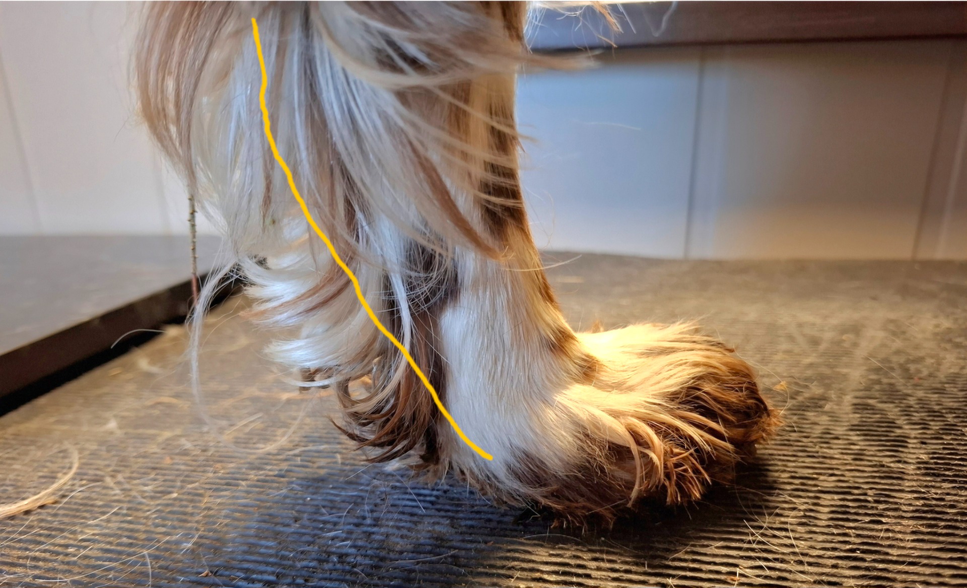 Bakpote og hase med for mye pels. Klipp bakpoten rund som frampoten. Hasen klippes i en lett bue slik at benstammen på foten virker tykk og kraftig. Se tegnet linje.