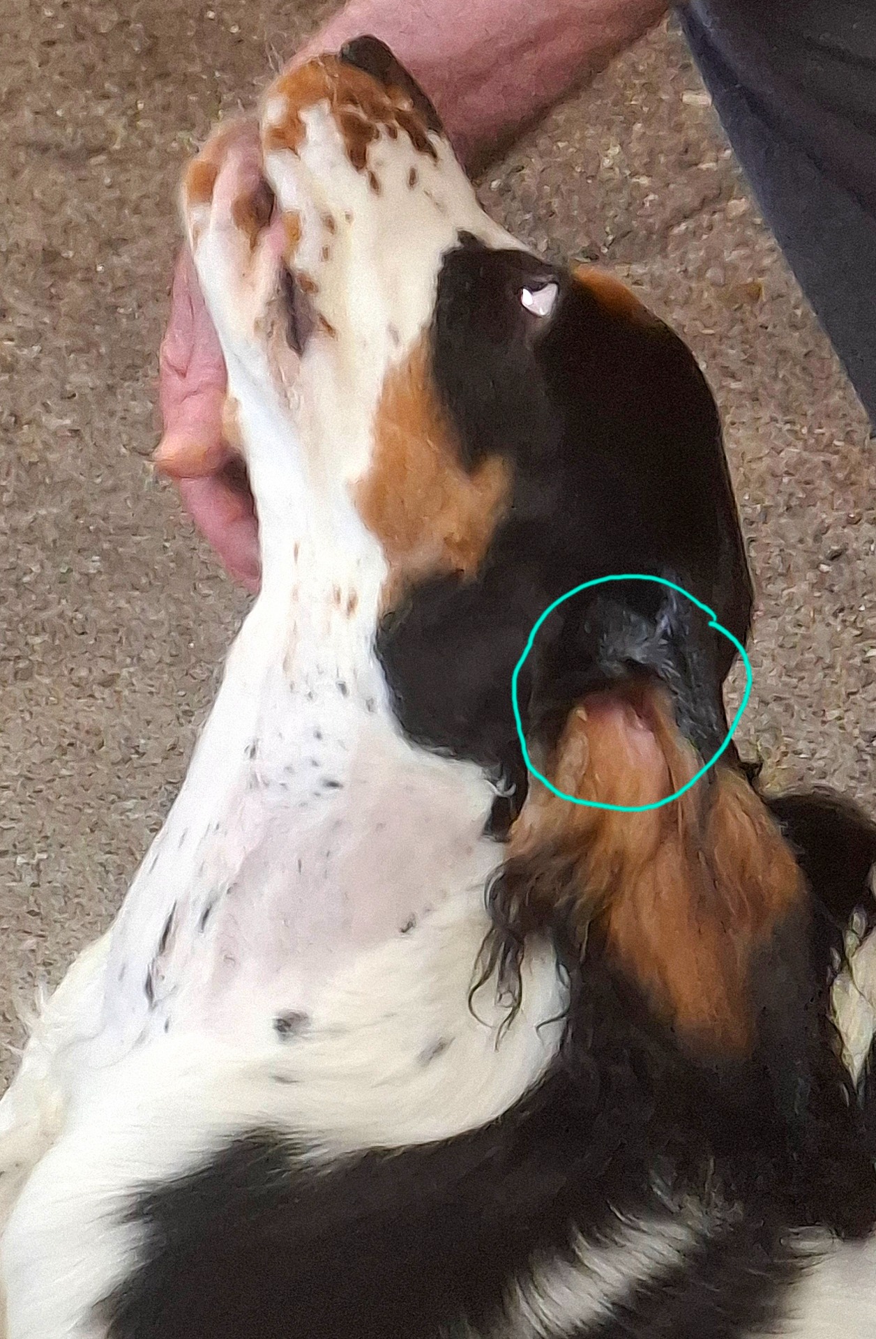 Riktig klippet ørefeste, kinn og hals. Man får frem det lave ørefestet og luft kommer til inni ørene. Huden på halsen får og luft. Ta av halsbånd når hunden er inne.