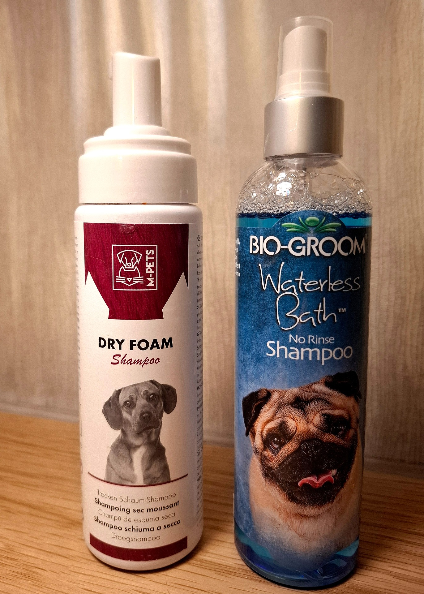 Noen hannhunder kan tisse på behenget under buken og dette kan skape litt dårlig lukt. En tørrshampoo/skum/spray kan hjelpe om du bruker litt under buken når hunden kommer inn etter å ha luftet seg. Tørk av med det samme med en håndduk. Begge disse dufter godt, den hvite av jojobaolje, den blå har svak lavedelduft. Den blå renser også bort misfarging/gult.