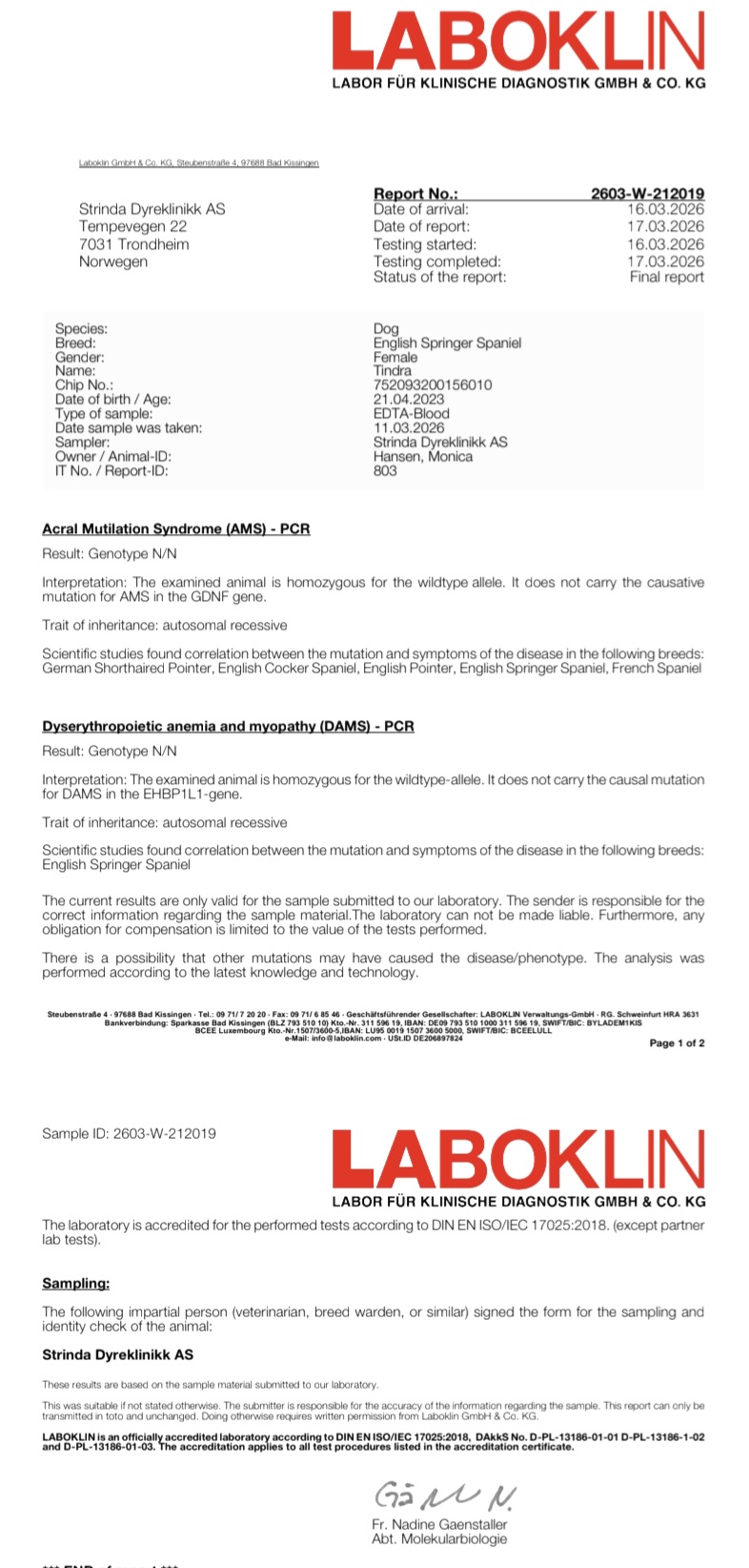 bekreftelse på testing for AMS og DAMS med resultat ikke bærer av gen for disse sykdommene.