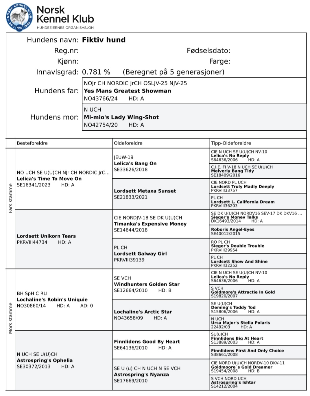 Over er den fiktive stamtavlen for planlagt kull, med de nærmeste generasjoner.
