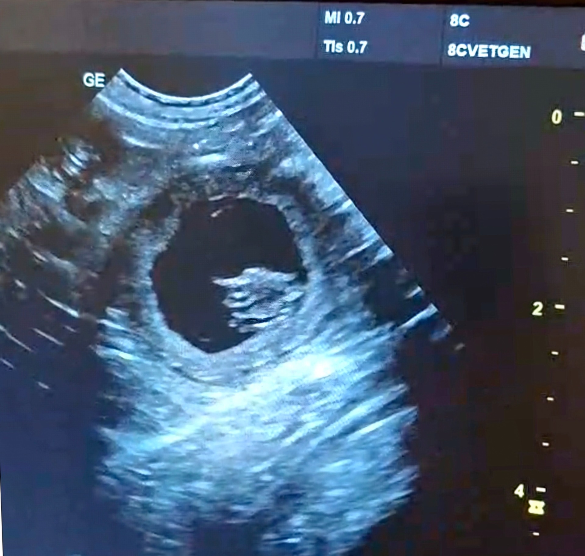 En liten titt med ultralydapparat hvor vi fikk et glimt av Carmas små hemmeligheter, veldig tidlig utvikling ennå, nær 4 uker gestasjonsalder. Dette er en fosterblære, det svarte er væske, og inni er et embryo som er omgitt av fosterhinner. Hjertet slår og dette kan ses på ultralyd.